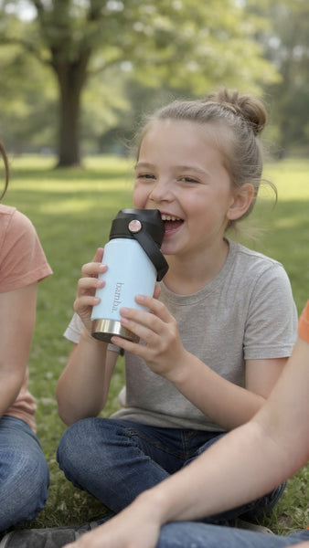 Child holding a light blue insulated bamba kids drink bottle outdoors with greenery in the background